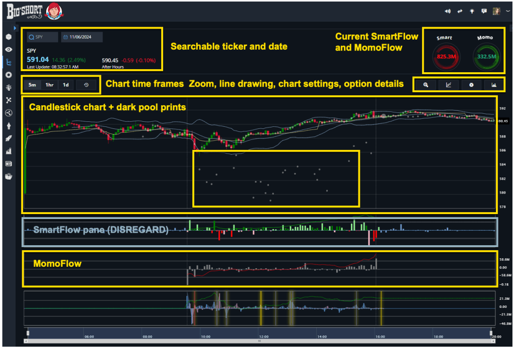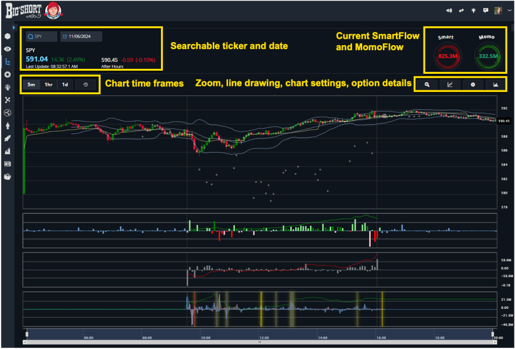In the upper right corner, you can see the current values for SmartFlow and MomoFlow. Under that, you can see all of our chart tools. Here, you can zoom in, draw lines, change your chart settings, use the tool tip to view all current values in a static, moveable and resizable pane, and see all option flow detail. You can see a description of all chart settings by hovering over the info icon. We offer these options because every trader has their own preference, for new users we recommend using the Recommended Settings.