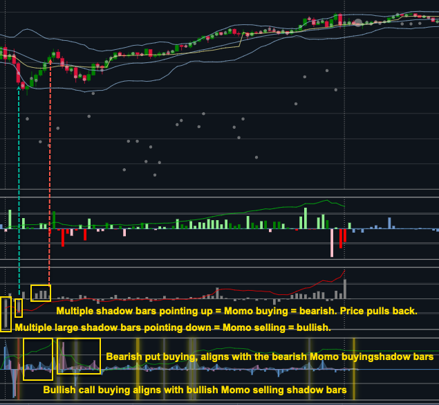 Pay attention here. Momo is a proxy for dumb money, and so MomoFlow is an inverse indicator. The shadow bar is MomoFlow for a given 5 minute bar, and the red line is the accumulation of MomoFlow throughout the day. If you see a big shadow bar pointing down, that means momo is dumping, and market makers are buying the dump. Think of it as a seesaw: the more the momo majority is on one side, the less room there is for a further move in that price direction, and the more incentive market makers have to take price in the opposite direction.