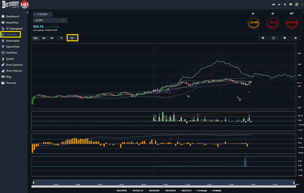 UltraFlow SimSearch shows the 5 trading days with the most similar price action to today’s, and shows how those days played out. It activates after 30 minutes and then updates every 2 seconds. It’s good to keep the SimSearch chart open in another window to see the potential patterns of the day. Read more about SimSearch here.