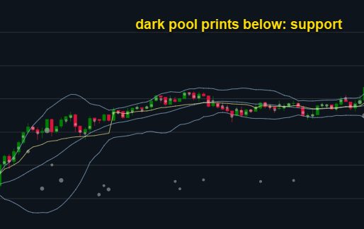 The first pane is the Candlestick Pane. Here we display dark pool prints directly on the chart, so you can easily see support and resistance levels. Price action is the number one indicator, that’s why it’s the biggest pane. Dark pools are our number two indicator. When there are a lot of dark pools clustered around the same price range, or big dark pools, above the current price this level acts as resistance, and below the current price this level acts as support.