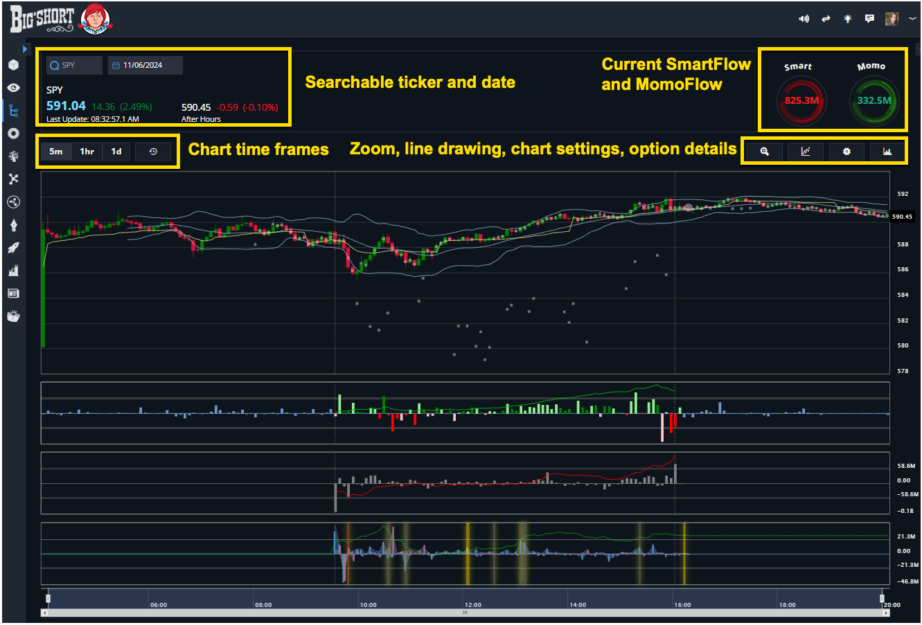 In the upper right corner, you can see the current values for SmartFlow and MomoFlow. Under that, you can see all of our chart tools. Here, you can zoom in, draw lines, change your chart settings, use the tool tip to view all current values in a static, moveable and resizable pane, and see all option flow detail. You can see a description of all chart settings by hovering over the info icon. We offer these options because every trader has their own preference, for new users we recommend using the Recommended Settings.