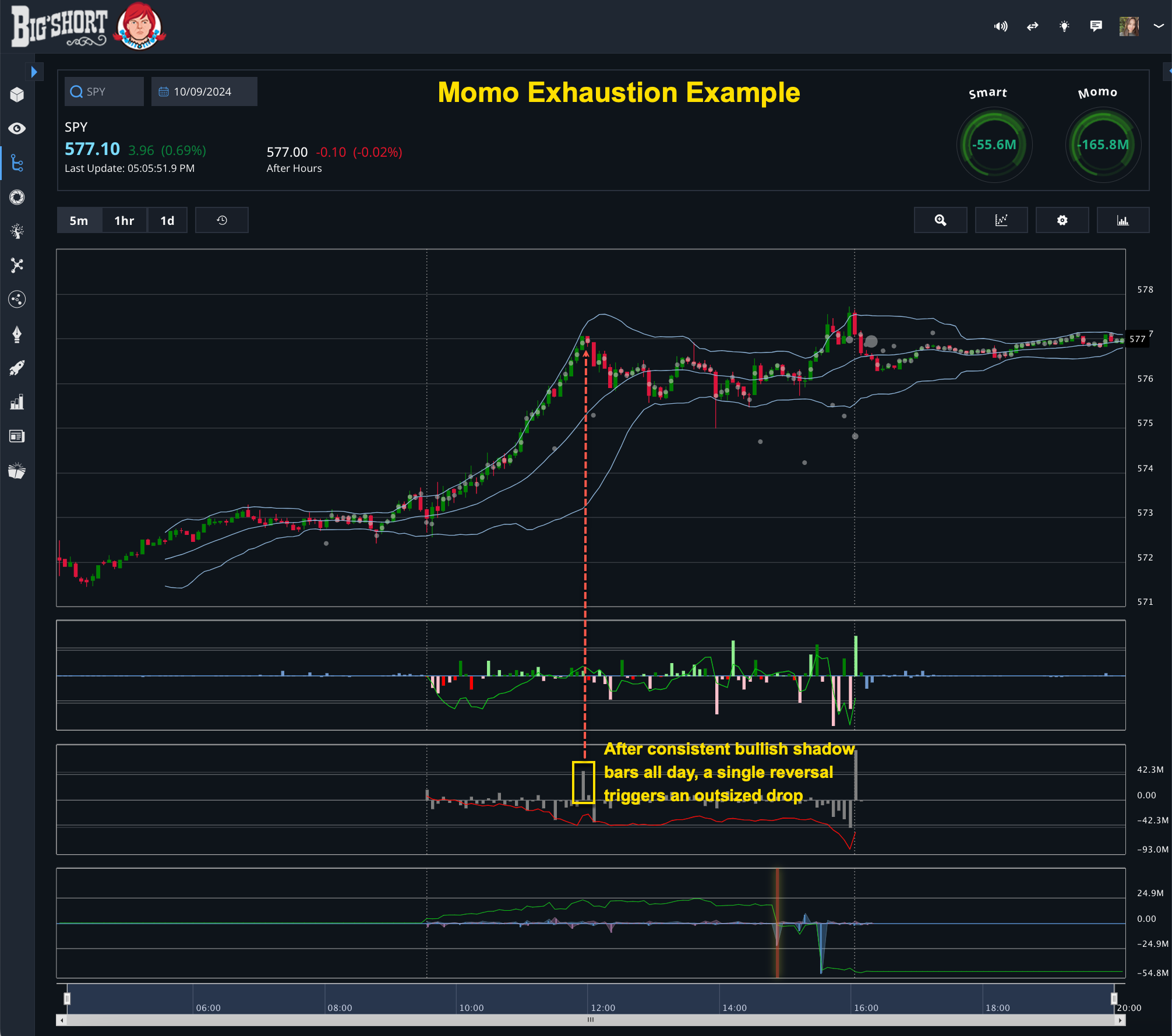 MomoFlow shadow bars tend to work better on non-Mondays, as SPY tends to be more momo-controlled on Mondays, especially Monday mornings.